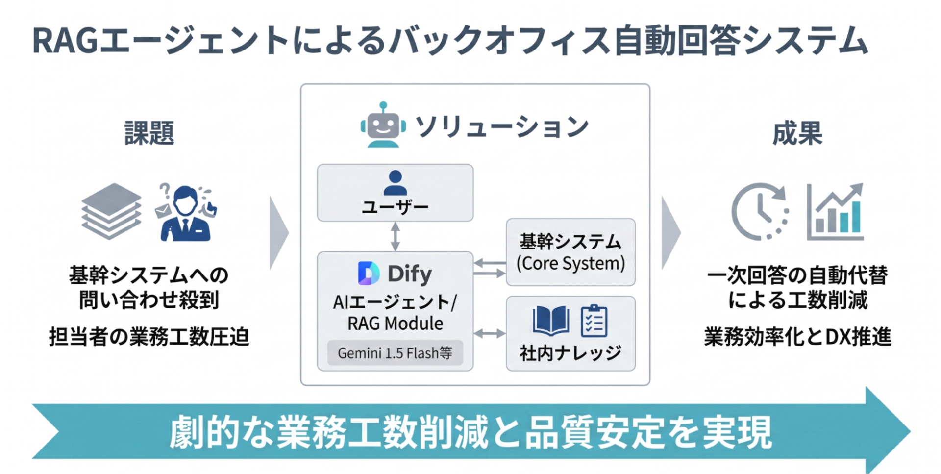 某アパレルメーカー様において、基幹システムへのデータ登録確認や依頼に関する問い合わせ対応業務を対象に、生成AI(RAGエージェント)を導入。DifyとGemini 1.5 Flash等を活用した高度な検索拡張生成システムを構築し、担当者の業務工数を劇的に削減、DX推進に貢献しました。